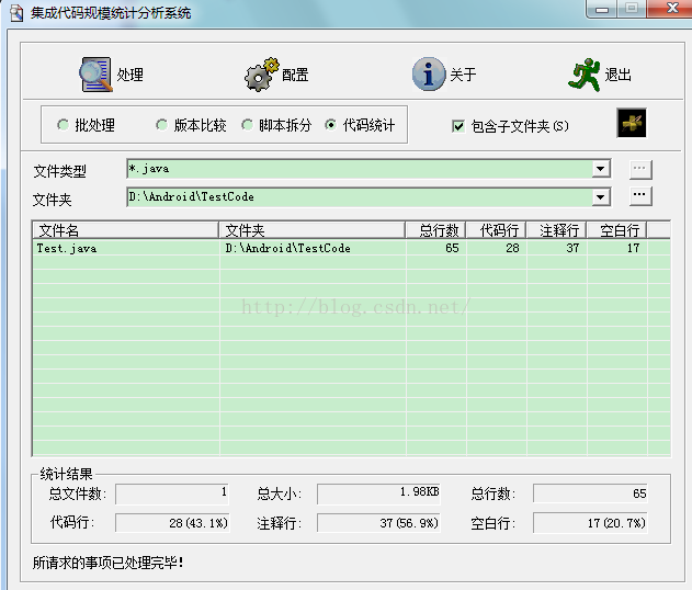 - 选择好文件类型和文件夹后,点击处理就可以开始代码统计工作,通过选择文件类型,可以实现对不同类型的代码进行分别统计的目的。