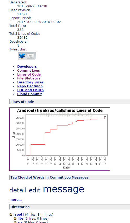 StatSVN是一个Java写的开源代码统计程序,从statCVS移植而来,能够从Subversion版本库中取得信息,然后生成描述项目开发的各种表格和图表。比如:代码行数的时间线;针对每个开发者的代码行数;开发者的活跃程度;开发者最近所提交的;文件数量;平均文件大小;最大文件;哪个文件是修改最多次数的;目录大小;带有文件数量和代码行数的Repository tree。StatSVN当前版本能够生成一组包括表格与图表的静态HTML文档。