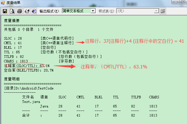 代码统计主要包括:注释行、空白行、代码行、总行数(不包括空白行)、总行数(包括空白行)、注释率、空白率、字符数。(也就是下图里面的度量项)